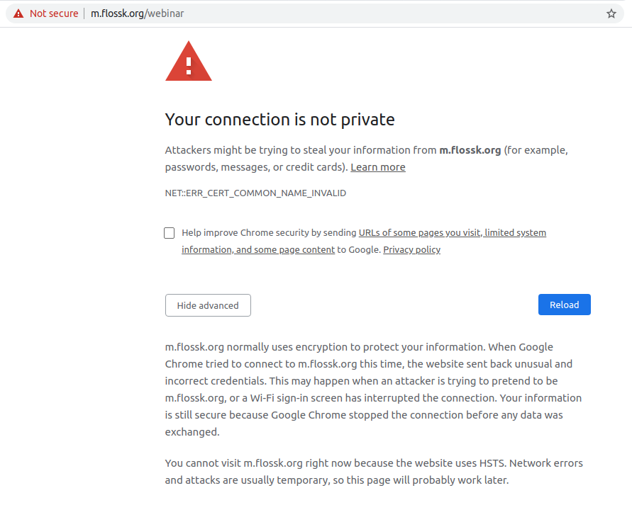Por ndërkohë, edhe një ridrejtim m1.flossk.org/webinar që e kam konfiguruar në serverin tonë më jep të njëjtin rezultat, me ingognito punon, kurse me tab normal jo (më jep të njëjtin mesazh).